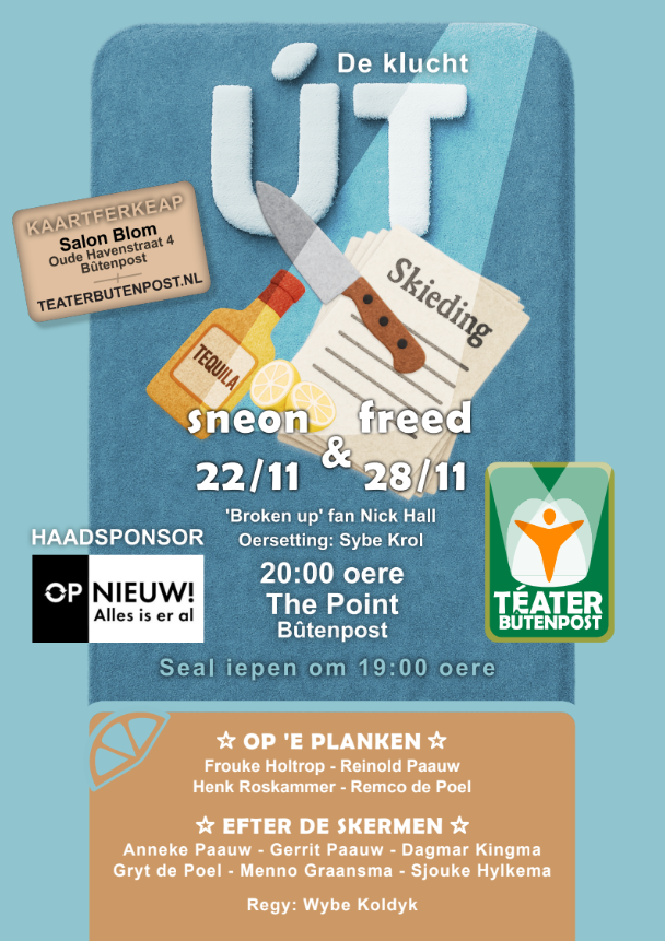 Téater Bûtenpost is op 24 maart 1922 as “Krite Bûtenpost en Omkriten fan it Selskip for Fryske Taal-en Skriftenkennisse”, oprjochte, koartsein Fryske Krite Bûtenpost. It doel fan De Krite wie it befoarderjen fan it Frysk. Dit troch ús memmetaal te sprekken, te lêzen en te skriuwen. Al rillegau waard it spyljen fan toanielstikken de wichtichste ferdivedaasje. En dat dogge wy dus no al mear dan 100 jier. Op ús webstek fine jo alle ynformaasje oer de ferieniging, aktuele saken dy’t spylje, de skiednis en hoe’t jo yn kontakt komme kinne mei ús. In soad sjoch- en lêsnocht tawinske.